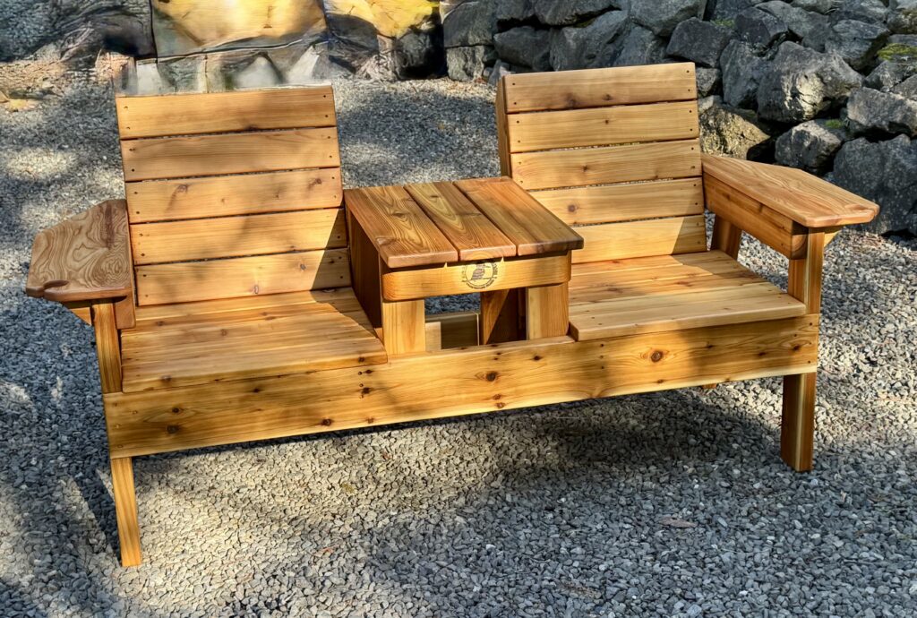 Two Seat bench with table top.  Arm rests include a handy wine glass holder. Made of solid cedar and protected with a lovely oil based finish. Perfect for gathering with friends around the fire pit or those long evening patio conversations.